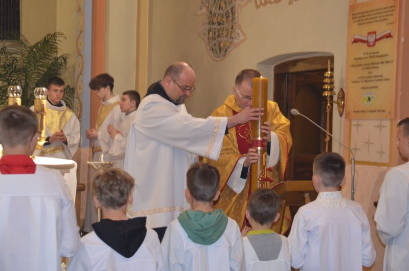 W naszym Kościele Liturgia Wigilii Paschalnej rozpoczęła się od poświęcenia ognia i paschału. Przy ogniu przygotowanym przez strażaków zapalono paschał który wniósł do ciemnego kościoła Ks. Proboszcz, trzykrotnie wypowiadając Światło Chrystusa!. Następnie Ksiądz Wikariusz odśpiewał Orędzie Paschalne.