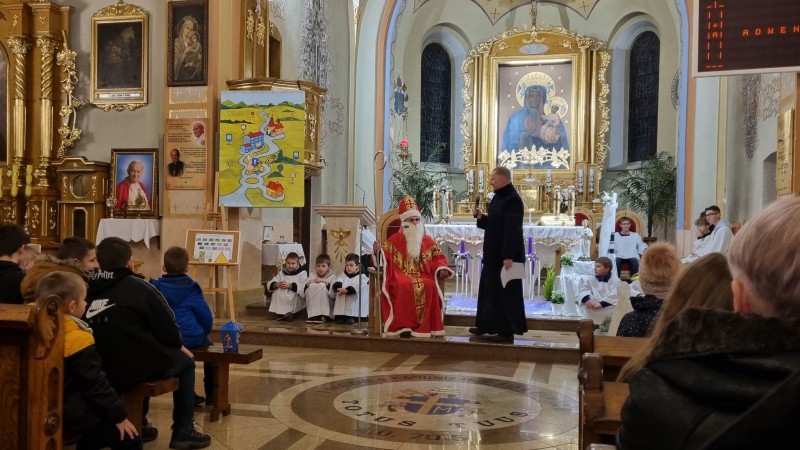 W dniu dzisiejszym po Mszy św. o godz.17 do naszej parafialnej światyni zawitał szczególny gość - był to Święty Mikołaj. W spotkaniu z Mikołąjem uczestniczyli ministranci, schola młodsza i starsza oraz dzieci z parafii. Mikołaj nie zapomniał też o Panu Kościelnym, Panu Orgniście oraz Księdzu Proboszczu. Miał też słodkie upominki dla wszystkich będących w tym dniu w świątyni. Dziękujemy Księdzu Proboszczowi za zaproszenie Świętego Mikołąja i mamy nadzieję, że w przyszłym roku również odwiedzi naszą parafię.