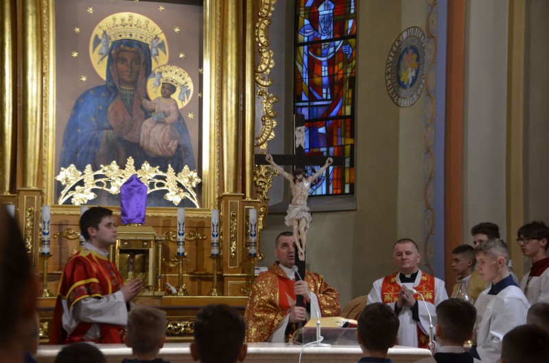 Liturgia Wielkiego Piątku upamiętnia tajemnicę męki i śmierci Pana Jezusa. Tego dnia Kościół nie sprawuje Eucharystii, lecz wzywa wiernych do adoracji krzyża. W naszej parafialnej świątyni zgromadziliśmy się o godz. 18.00. Liturgię rozpoczęliśmy procesją wejścia w milczeniu i modlitwą. Celebrans upadł na twarz przed ołtarzem i modlił się, leżąc krzyżem. Potem rozpoczęła się liturgia słowa, której centrum stanowił opis Męki Pańskiej według Świętego Jana. W rozbudowanej modlitwie wiernych, modliliśmy się w szczególnych intencjach, ogarniając cały świat i wszystkich ludzi, także tych, którzy jeszcze nie poznali Pana Boga. Następnie była adoracja krzyża – znak męki i zwycięstwa nad śmiercią naszego Pana Jezusa Chrystusa. Kolejnym obrzędem był Komunia Święta. Ostatnią częścią liturgii Wielkiego Piątku była procesja do Grobu Pańskiego. Na specjalnym tronie nad grobem wystawiony został Najświętszy Sakrament w monstrancji okrytej białym przejrzystym welonem – symbolem całunu, w który owinięto ciało zmarłego Chrystusa. Ukryty w monstrancji Najświętszy Sakrament napawa nadzieją, że Pan życia i śmierci jest z nami wciąż obecny. Od tej pory adorujemy Jezusa w grobie.
