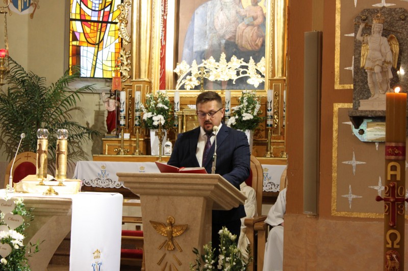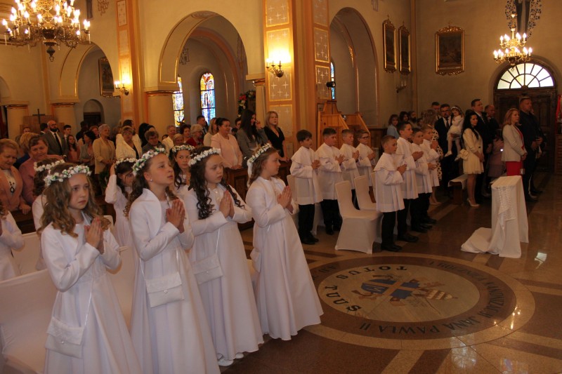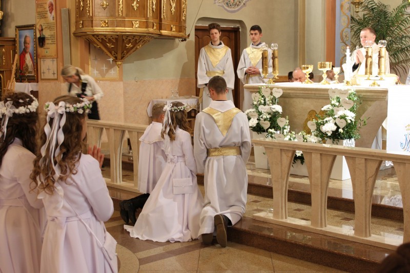 W dniu dzisiejszym w naszej parafii uczniowie klasy III przyjęły po raz pierwszy do swoich serc Pana Jezusa. W sobotę wraz ze swoimi rodzicami i bliskimi przystąpiły do Sakramentu Pokuty. Dzieci do Komunii św. przygotowywał Ks. Proboszcz. Podczas Eucharystii dzieci i rodzice właczyli się w jej obstwę czytając czytania, śpiewając psalm i pieśni oraz składane dary ofiarne. Od poniedziałku dzieci będą uczestniczyły w dziękczynieniu za przyjęty sakrament.