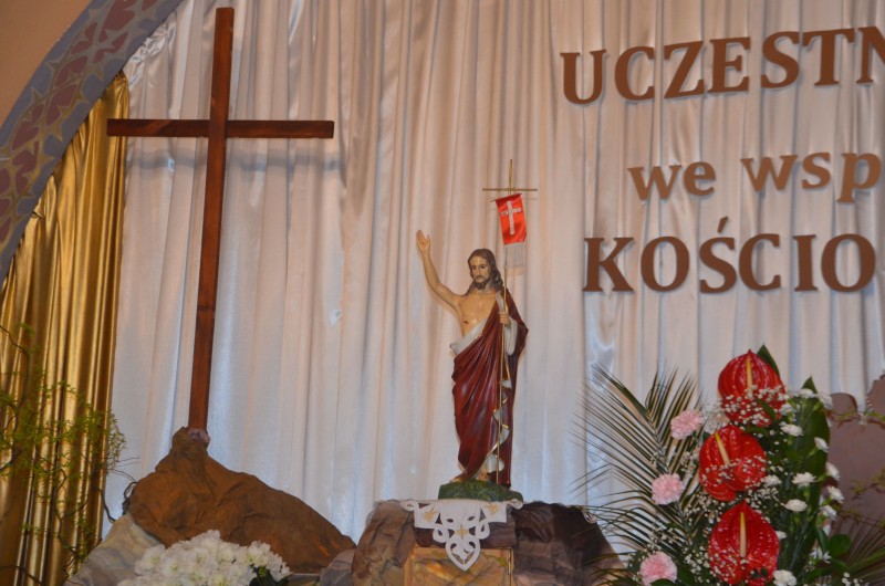 Niedziela Zmartwychwstania jest zakończeniem obchodów Wielkiego Tygodnia i celebracją radości i triumfu zmartwychwstałego Jezusa. Obchody Zmartwychwstania o świcie rozpoczęła uroczysta procesja z Najświętszym Sakramentem wyniesionym z grobu Pana Jezusa. Na przedzie procesji rezurekcyjnej niesiona była figura zmartwychwstałego Chrystusa, która została umieszczona przy ołtarzu w prezbiterium. Obok figury niesiony był krzyż z czerwoną stułą - wymowny symbol Chrystusa-Kapłana. Po procesji wierni uczestniczyli we Mszę św. rezurekcyjnej. Na zakończenie Ksiądz Proboszcz złożył wszystkim życzenia i udzielił uroczystego błogosławieństwa. Po porannej rezurekcji zasiedliśmy do uroczystego śniadania wielkanocnego.