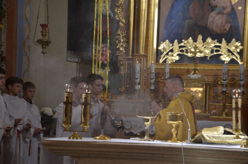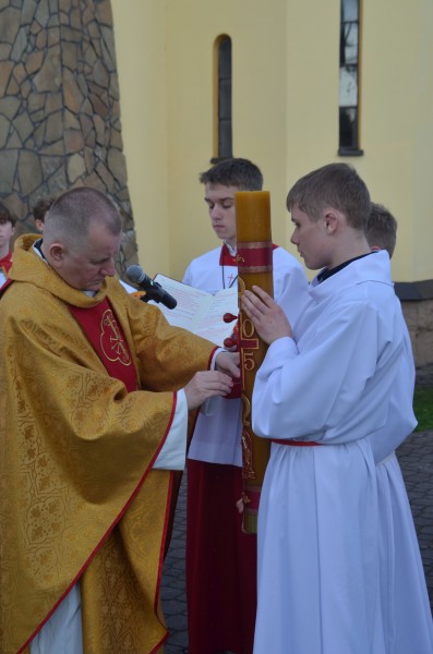 Podczas Wigilii Paschalnej, późnym wieczorem miał amiejsce obrzęd światła, na który składają się: poświęcenie ogniska, zapalenie paschału i uroczyste wniesienia go do świątyni z trzykrotnym oznajmieniem: ŚWIATŁO CHRYSTUSA . Na koniec tej części Ksiądz Łukasz odśpiewał Exultet – przepiękną pieśń na cześć światła, którym jest Chrystus. Kolejna to Liturgia Słowa – szczególnie bogata w tym dniu – ma nam przypomnieć najważniejsze momenty z historii zbawienia, zwłaszcza przejście ludu Izraela przez Morze Czerwone. Ewangelia opowiada o odkryciu w wielkanocny poranek przez niewiasty pustego grobu Chrystusa. Następnie było poświęcenie wody chrzcielnej, które zakończyło się odnowieniem przyrzeczeń sakramentu chrztu św. Na koniec Liturgia Eucharystyczna tej nocy jest wielkim dziękczynieniem za wydarzenia paschalne.