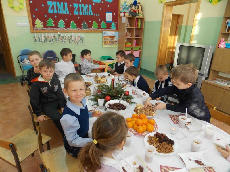 W udekorowanych świątecznie salach zapalono choinki przystrojone ozdobami wykonanymi przez uczniów. Na stole nakrytym białym obrusem zapłonęły wigilijne świece. Po wspólnej modlitwie wszyscy podzielili się opłatkiem i złożyli sobie życzenia. Uroczystości towarzyszyły dźwięki kolęd płynących z magnetofonu i śpiewanych przez dzieci. Dzieci były bardzo zaangażowane w przebieg wigilii, udzielał się im już świąteczny nastrój, a przygotowane potrawy smakowały inaczej niż zwykle.