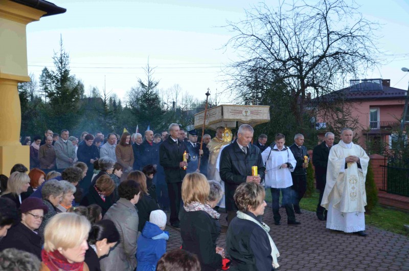 W naszej parafii odprawiona została w niedzielę o godzinie 6 rano. Przewodniczył jej Ks. Proboszcz. Procesję uświetnili ministranci, strażacy, niesione przez dziewczęta feretrony i licznie zgromadzeni wierni. W procesji obok Hostii w monstrancji niesiony był krzyż procesyjny ozdobiony na tę okazję czerwoną stułą oraz figurka Jezusa Zmartwychwstałego.