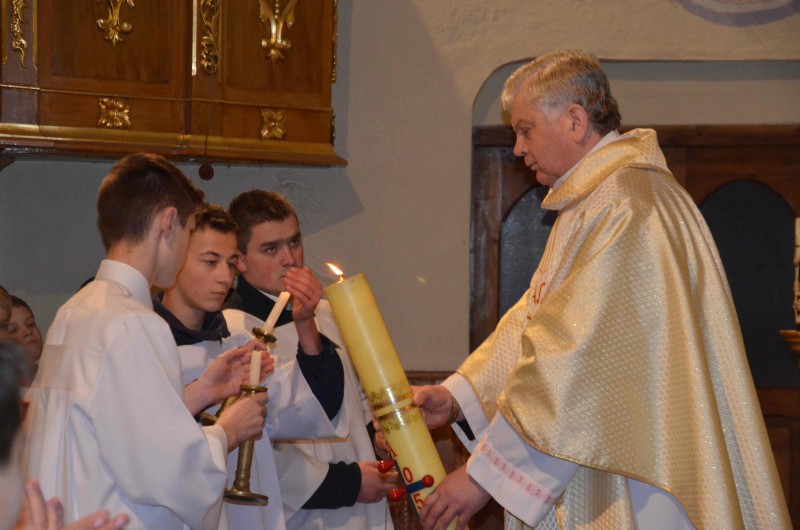 Następnie wniósł Paschał do okrytej mrokiem świątyni, a wierni zapalili od niego swoje świece. Zwieńczeniem obrzędu światła była uroczysta pieśń (Pochwała Paschału) - Exultet, którą wyśpiewał Ks. Józef.