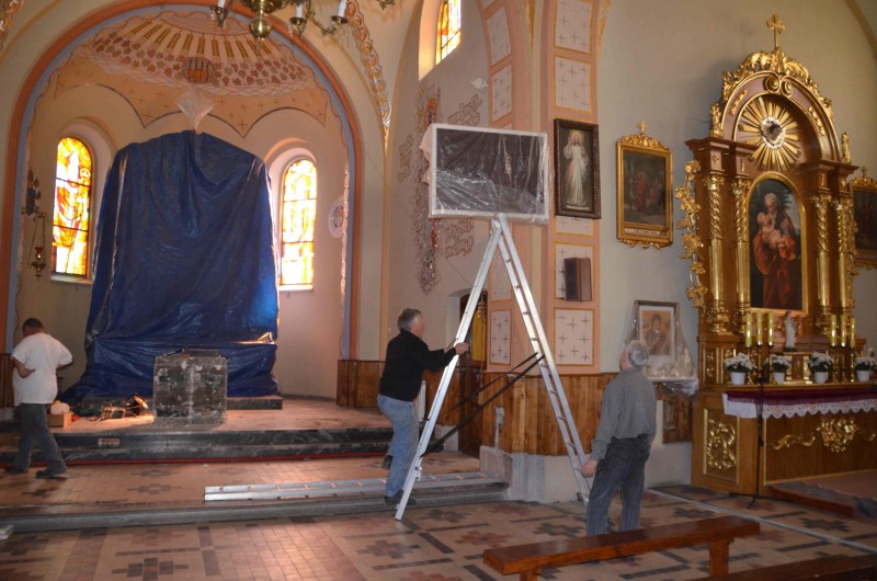W minionym tygodniu rozpoczęły się prace remontowe kościoła. Od poniedziałku do piątku wykonano nowy podłącz instalacji elektrycznej, a w piątek rozpoczęły się prace rozbiórkowe balasek, ołtarza i ambonki, posadzki prezbiterium oraz mocno zniszczonej podłogi w „starej” zakrystii. Wcześniej wyniesiono meble i zbędne na czas remontu wyposażenie świątyni, zabezpieczono przed zakurzeniem ołtarz i ambonę. W tym tygodniu planuje się wykonanie wylewek nowych stopni w prezbiterium ocieplenie i wykonanie wylewki w „starej” zakrystii oraz rozpoczęcie rozbiórki posadzki na kościele. Msza św. na codzień odprawiana jest przy bocznym ołtarzu NS Pana Jezusa.
