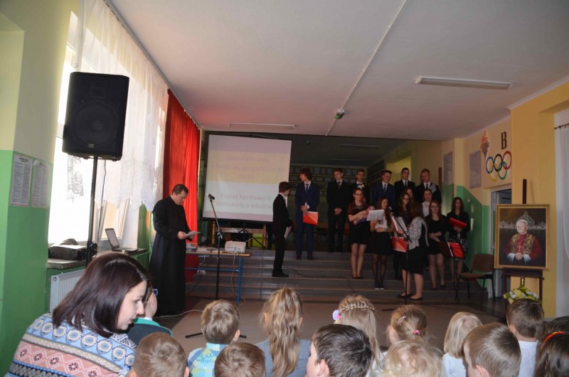 W 95 rocznicę urodzin Św. Jana Pawła II w naszym Gimnazjum odbyła sie Uroczystość z okazji Dnia Patrona. Spotkanie zorganizowano z udziałem zaproszonych gości, min. obecny był Proboszcz Parafii Ks. Prałat Jan Krupiński, Burmistrz Miasta i Gminy w Zagórzu - P. Ernest Nowak, dyrektorzy placówek oświatowych Tarnawy, uczestnicy konkursu poświeconego osobie Jana Pawła II, nauczyciele i uczniowie Gimnazjum. W programie Katecheta, Ks. Janusz Łuc przybliżył postać Patrona, młodzież zaprezenyowałą montaż słowno - muzyczny. Na zakończenie wręczono nagrody dla dzieci i uczniów bioracych udział w konkursie o Janie Pawle II.