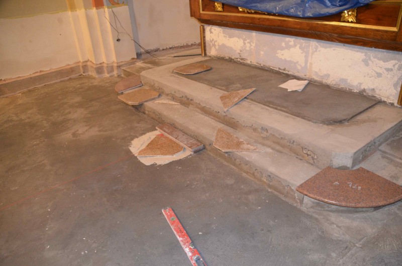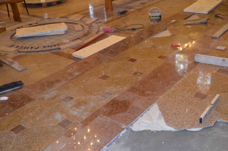 Aktualnie zamontowano juz płyty "pod dzwonnicą" i w starej zakrystii. Ułożona już jest prawie całkowicie posadzka na kościele. Obrobiono "lamperie" w prezbiterium, i przygotowano pod ułozenie tzw. "Glinki weneckiej". W najbliższym czasie zamontowane zostaną płyty i stopnice w prezbiterium, docinane będą wykończenia, układane cokoły na ścianach, obrabiane filary, montowane płyty w zakrystii, montowane płyty antyposlizgowe przed wejściem i w przedsionku kościoła oraz zamontowane bedzie koło centralne krzyża na posadzce z Herbem papieskim Świętego Jana Pawła II. Prace powinne zakończyc się do Bożego Ciała.