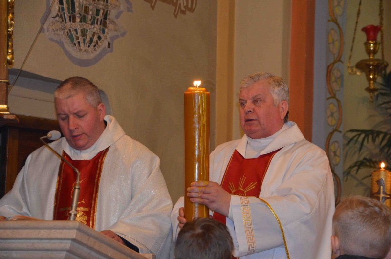 Wieczorem o godz. 18.00, po zachodzie słońca, rozpoczęliśmy celebrację nocy Zmartwychwstania Chrystusa. Liturgia Wigilii Paschalnej składa się z czterech części; Liturgii Światła, Liturgii Słowa, Liturgii Chrzcielnej i Liturgii Eucharystii. Po raz pierwszy od Środy Popielcowej, śpiewane jest uroczyste Alleluja, które zwiastuje Zmartwychwstanie. Liturgię wielkosobotnią uświetnił śpiew scholi dziecięcej i młodzieżowej.