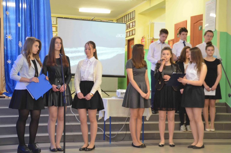 Uczniowie gimnazjum po wprowadzeniu sztandaru i odśpiewaniu hymnu szkoły zaprosili wszystkich zebranych do wysłuchania programu słowno – muzycznego składającego się z wybranych utworów poetyckich Karola Wojtyły, w których ten niezwykły poeta kazał się zdumiewać, zastanawiać, wybierać i szukać Miłości, którą jest sam Bóg, pokazał wartość Ojczyzny w jej historii, tradycji, ludziach i przyrodzie, zachęcał do refleksji nad życiem, ukazał dylematy moralne współczesnego człowieka. Cały program bardzo się podobał, a szczególnie dużo braw otrzymali wykonawcy piosenek: „Strumień”, „Psalm dla Ciebie” oraz „Miłosierni”.