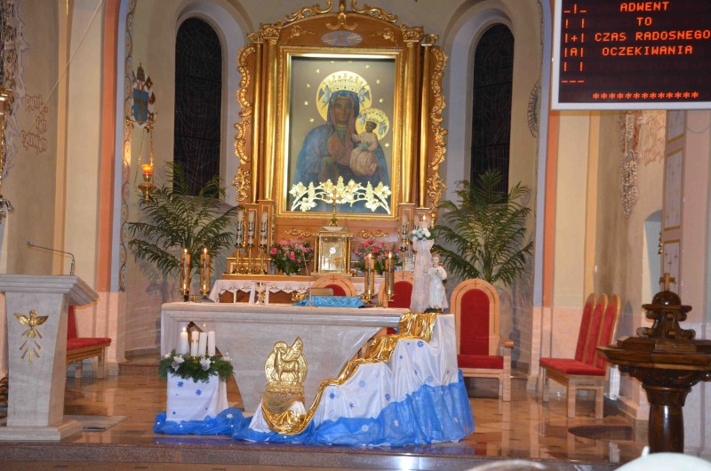 W naszym kościele przygotowano na ten czas symboliczną dekorację. W każda kolejną niedzielę zapaalna jest kolejna świeca adwentowa. Co tydzień w sobotę obecne na Eucharystii dziecko umieszcza figurkę Jezusa o stopień niżej co przypomina nam o zbliżającym się Bożym, Narodzeniu.