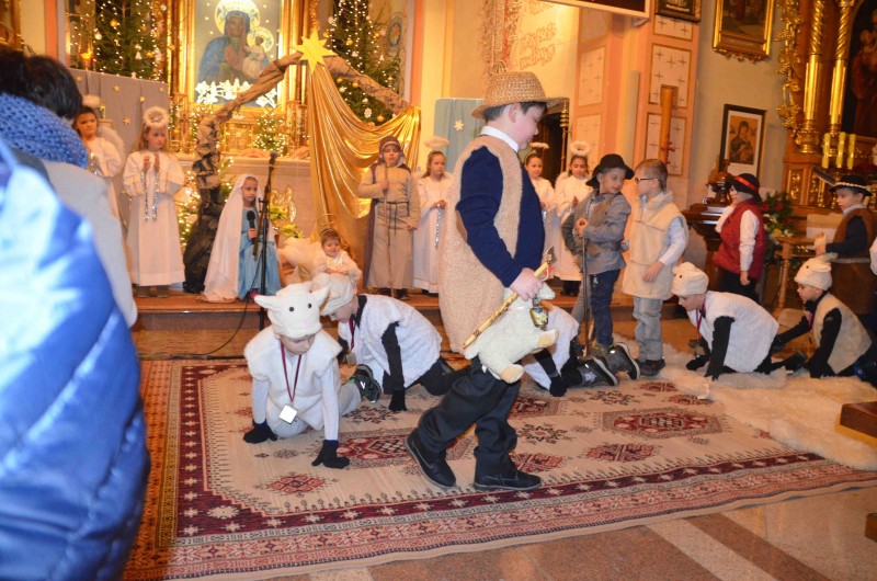 W pięknie udekorowanej świątyni, wśród blasku choinek, mali aktorzy starali się wiernie odtworzyć wydarzenia sprzed 2000 lat przenosząc obecnych na krótką chwilę do Betlejem. Dzieci wcieliły się w postacie, które oczekiwały na przyjście Jezusa Chrystusa na świat. A ta szczególna noc, noc narodzin Zbawiciela Jezusa Chrystusa została przybliżona przez Anioły, skromnych pastuszków, owieczki oraz Mędrców ze Wschodu. Wraz z trzema królami złożyli pokłon Świętej Rodzinie – Maryi, Józefowi i maleńkiemu Jezusowi.