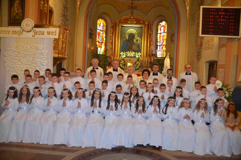 W dniu dzisiejszym o godz. 12.00 odbyła się w naszym kościele uroczystość Pierwszej Komunii św. Dzieci klas III przygotowywał i prowadził ks. Grzegorz Lęcznar, który też przewodniczył uroczystej Mszy św.. Eucharystię koncelebrowali Proboszcz parafii Ks. Prałat Jan Krupiński, Ks. Marek Zarzyczny, który wygłosił Słowo Boże oraz Ks. Prałat Zbigniew Suchy i Ks. Zbigniew Mackiewicz. W obstawę Mszy św. włączyli się również rodzice. Schola parafialna uświetniła uroczystość swoim śpiewem. Od jutra dzieci rozpoczną biały tydzień, dlatego módlmy się za wszystkie dzieci pierwszokomunijne, by przez całe życie pozostały w łączności z Panem Jezusem i nie straciły wiary, a ich życie było ciągłym jej pomnażaniem.