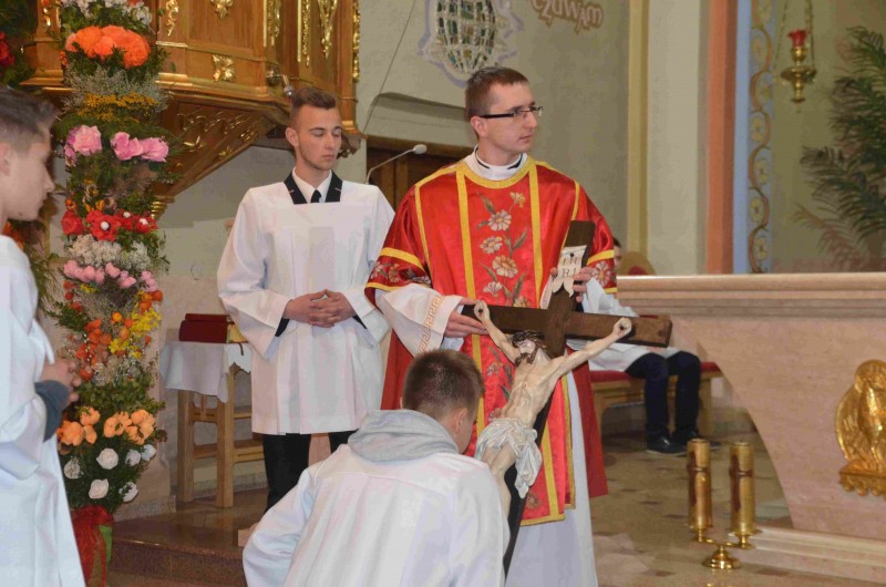 Licznie zgromadzeni parafianie wysłuchali Liturgię Słowa z opisem Męki Pańskiej, następnie adorowali Krzyż i przyjęli Komunię Św. Na zakończenie Liturgii Wielkopiątkowej przeniesiono Najświętszy Sakrament do grobu, gdzie będzie adorowany do godz.22.00.