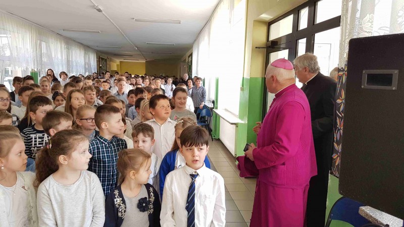 2 kwietnia 2019r. naszą szkołę odwiedził Ksiądz Arcybiskup Adam Szal, który przybył do nas w towarzystwie sekretarza ks. dr. Łukasza Jastrzębskiego, ks. dziekana Jana Krupińskiego, ks. wikariusza Grzegorza Lęcznara. Gosci przywitał dyrektor szkoły podstawowej Melchior Ryniak oraz młodzież, która przygotowała na tę uroczystość krótki montaż słowno – muzyczny, składający się z wierszy napisanych przez Karola Wojtyłę – Jana Pawła II. Wizyta Ks. Arcybiskupa była też okazją do uczczenia 14 rocznicy śmierci naszego Patrona Ojca Świętego Jana Pawła II.