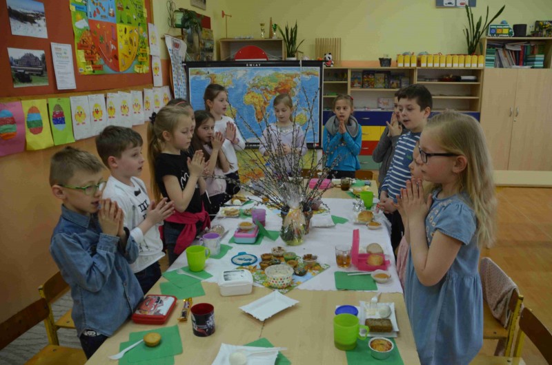 Nieco wcześniej niż zwykle w klasach młodszych odbyły się w tym roku spotkania z okazji Świąt Wielkanocych. Tradycyjnie dzieci przygotowały się do tego spotkania. W klasie Ia pieczone były babeczki, inni robili pisanki, dekorowali swoje klasy. Podczas śniadania przy wspólnym stole spożywali jajka z chrzanem i degustowali słodkie baby. Spotkania tegotypu wpisane w program wychowawczy jednoczą klasy i pomagają w procesie wychowawczo - dydaktycznym.