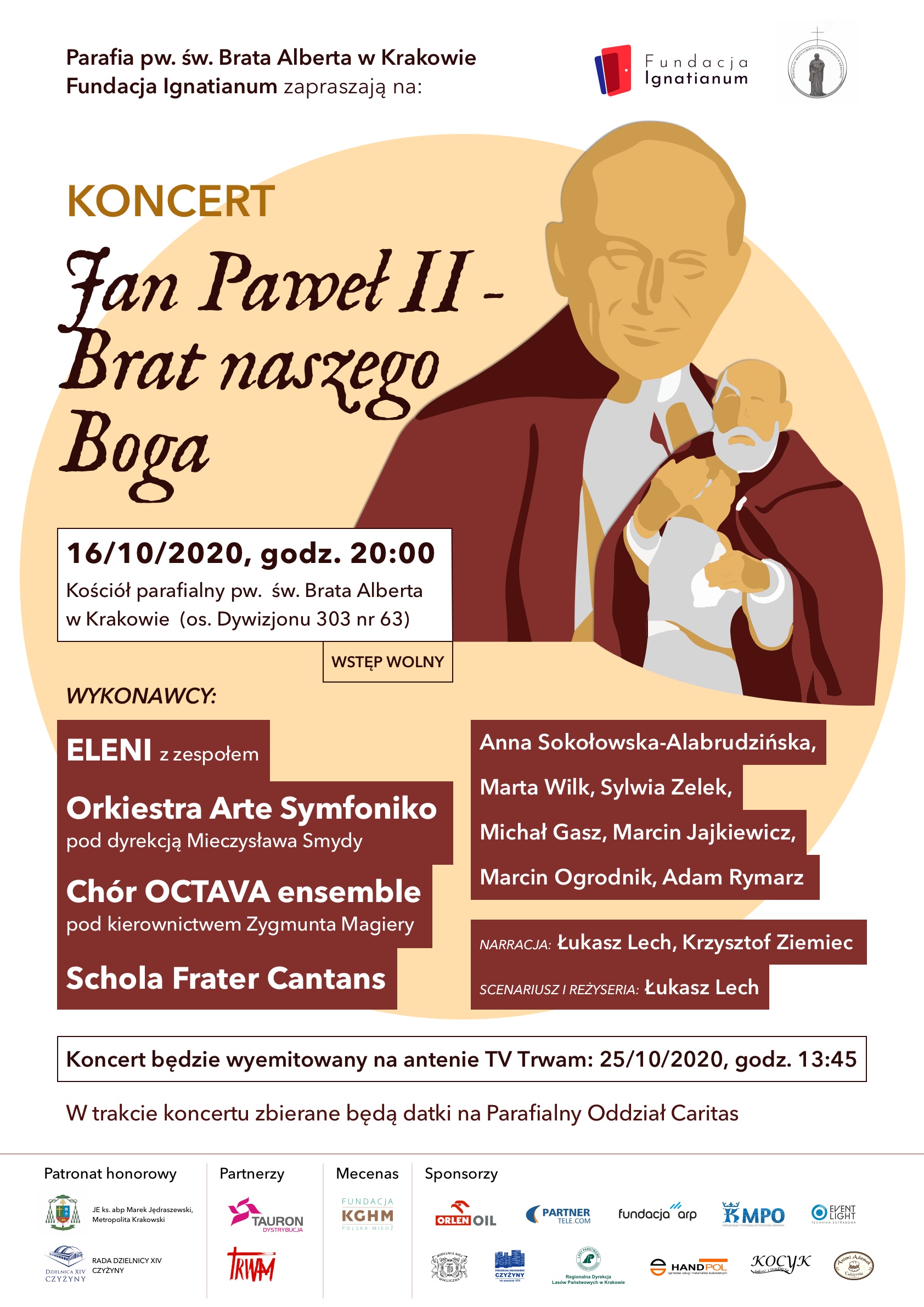 16 października br. w kolejną rocznicę wyboru na Stolicę Piotrową kard. Karola Wojtyłę zapraszamy na koncert do Krakowa pt. "Jan Paweł II i Brat naszego Boga", którego inicjatorem i organizatorem jest ks. Łukasz Pałacki wraz z archidiecezją krakowską i parafią św. Brata Alberta w Krakowie pod patronatem metropolity krakowskiego ks. abp. Marka Jędraszewskiego.