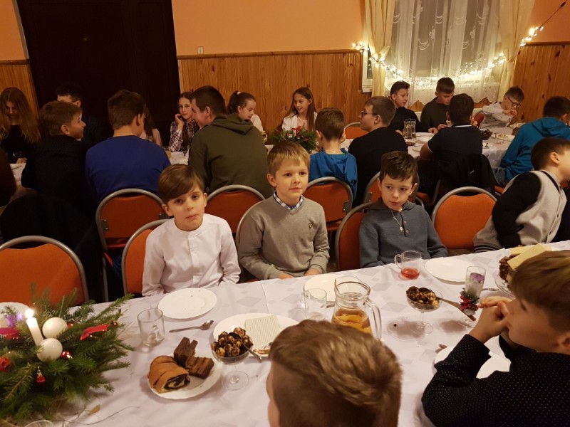 W czwartek po Mszy św. wieczornej odbyło się spotkanie wigilijne dla dzieci i młodzieży ze wspólnot parafialnych. Uczestniczyło w nich ok. 70 osób. Byli to ministranci, schola, oaza młodsza i starasza. Spotkanie miało miejsce w sali Domu Ludowego w Tarnawie Górnej. Inicjatorem spotkania był Ks. Karol Wandas. Spotkanie swoją obecnością zaszczycił i oficjalnie rozpoczął Proboszcz Parafii, ks. Krzysztof Sobiecki. Podczas spotkania dzielono się opłatkiem, złożono sobie życzenia, śpiewano kolędy. Członkinie Kół Gospodyń Wiejskich oraz rodzice zadbali o barszczyk z uszkami oraz pyszne pierogi. Nie brakowało też słodkości i napojów. Jak widać dzisiejsze dzieci i modzież potrzebują tego typu spotkań a w parafii są osoby, które pomogą takie spotaknia zorganizować. Bóg zapłać wszystkim.